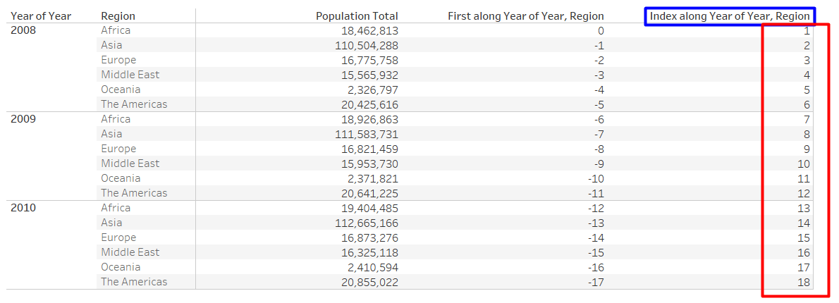 Example: The below snapshot shows the yearly population across regions. When FIRST() is being calculated with respect to “Year” and “Region” the offset of the first row from the second row is -1